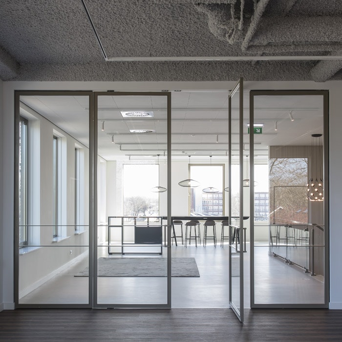 At the luxury bridal fashion house Ladybird in Huizen, we coated double pivot doors with side windows in the trendy colour Peal Grey RAL 1035! Exclusive bridal brands demand an exclusive office interior, and the pivot doors are a real eye-catcher in this office setting. The pivot doors are combined with the versatile single-glazed Glass-Concept partition. That’s craftsmanship!