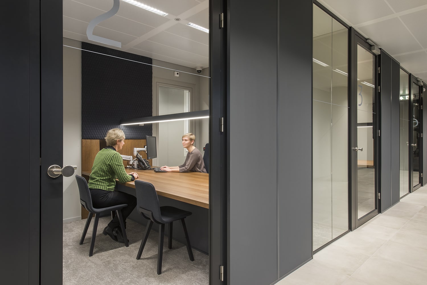 The Taxes and Customs office is part of ‘OV Breda Centraal’ public transport terminal. In terms of atmosphere, appearance, materials and use of colour, an explicit connection was sought with the existing building so that everything blends in perfectly. To create the right office environment, various closed partitions were removed, and transparent ones replaced in the existing offices. This ensures a connection with the work floor and creates more light and spaciousness.