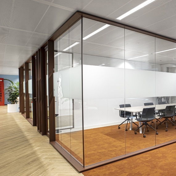 A glass partition with wide profiles at the top and bottom is Ricardo Rail’s statement. SKYE lends itself perfectly to this. A coating in red-brown oxide colour was chosen. This makes the profiles of the partition resemble railway tracks. The SKYE partition has wide profiles and yet it still remains slender in design. The width forms the statement, and the colour makes it a visible subject in the office.